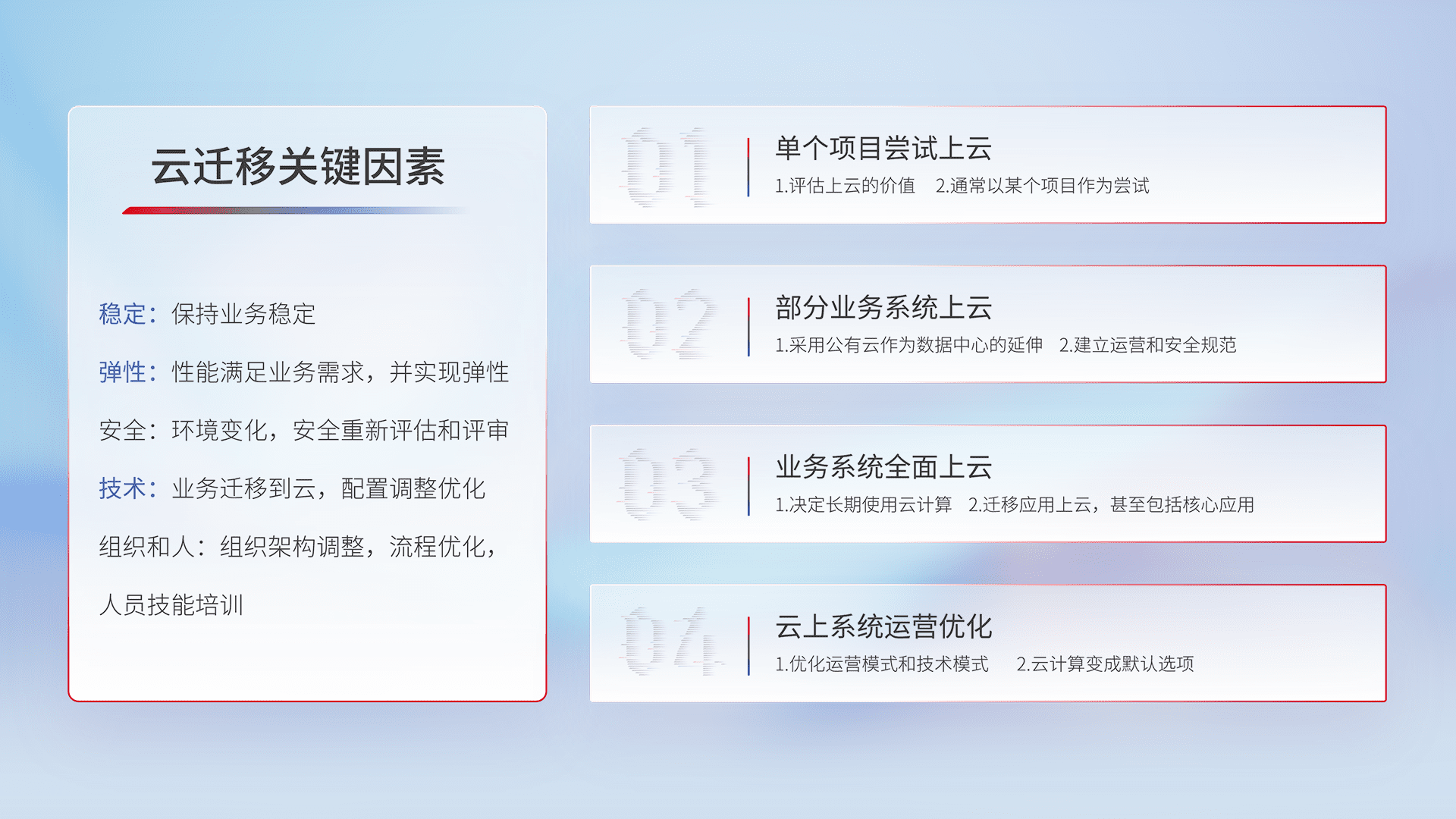 结合实际业务,,从规划设计、、、、云平台选型、、、云原生改造、、、、数据迁移、、集成交付,,迁移全过程为客户识别最佳上云路径,,,做好风险识别管理,,设计网络架构、、、身份权限、、、安全审计合规、、、、操作审计、、、日志审计、、、、监控告警策略、、、多站点容灾设计等,,对云上基础设施进行整体规划,,提升IT治理水平,,以满足弹性、、、、高可用、、、高性能的需求。。。
