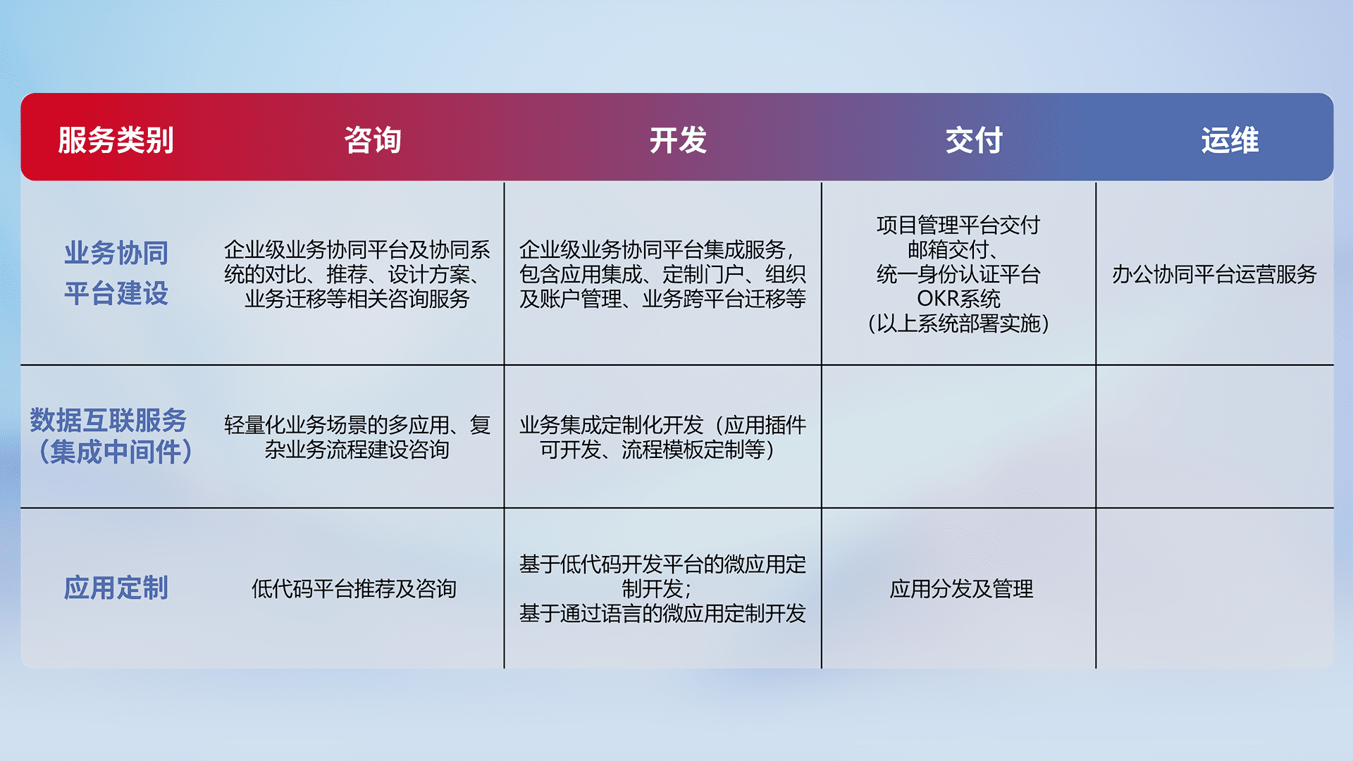 针对钉钉、、、、企微、、、、IDaas等平台级产品提供产品的规划、、、、方案、、交付、、定制化开发等服务,,实现如统一协同办公、、、、智能客户服务、、、、混合会议管理、、、智能数据查询、、、等业务场景,,,实现数字化转型。。